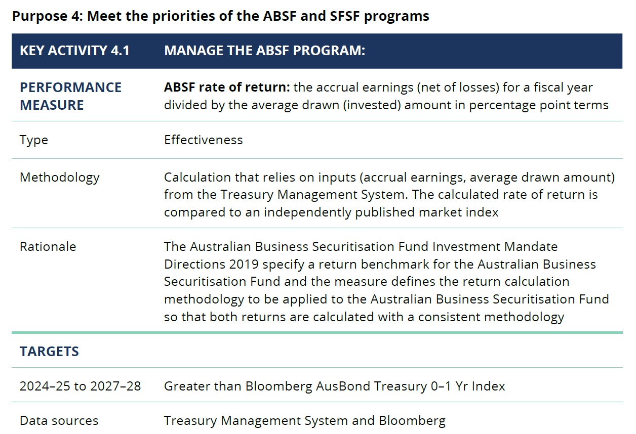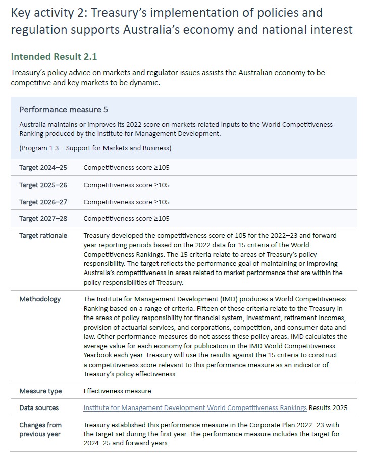 The Department of the Treasury uses structural techniques in the performance section of its corporate plan to demonstrate how the performance measure relates to its key activities. For example, Performance measure 5 below directly relates to Key activity 2. This approach is typically adopted by entities with a single purpose statement.