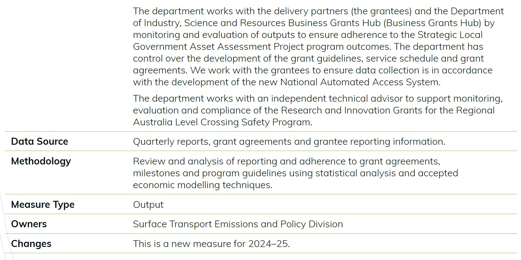 By contrast, for an entity with purposes or key activities relating to the provision of policy advice to government on legal matters, readers may find it difficult to understand how measures such as ‘Number of visitors to the entity’ or ‘Investment in new technologies ($)’ relate to the entity’s purposes. There is no clear connection between these measures and the purposes or key activities of the entity. Further, it may be difficult for the entity to demonstrate its level of achievement against its purposes through such measures.