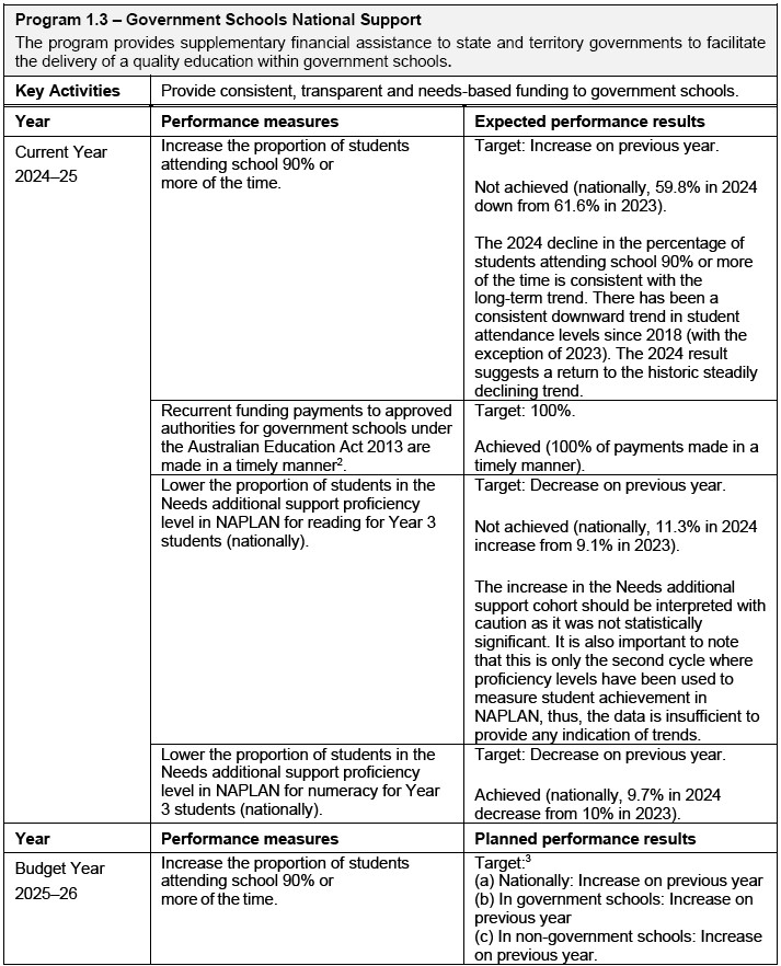 The Department of Education in the 2025–26 Education Portfolio Budget Statements (pages 31 and 32) reported its performance information under Outcome 1, Program 1.3 and the related key activity. In the example below, the performance information: