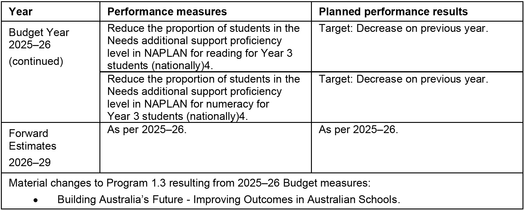 - the Planned performance results for the Forward estimates are reported ‘As per 2025–26’ to indicate the performance measures and associated targets are the same (unchanged) from the Budget year